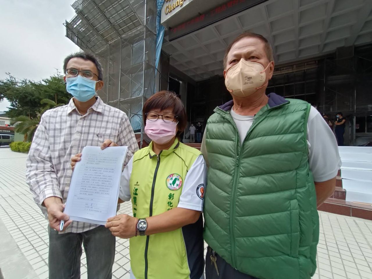 ▲縣議員參選人江熊一楓與李俊諭陪同溪州陳姓鄉民(中)到縣警局陳情。(圖/記者唐詠絮攝)