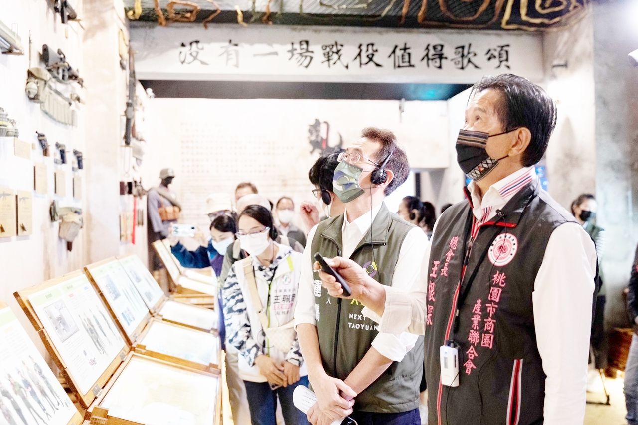 ▲鄭運鵬今(11)日參訪位於平鎮區的異域故事館,聽取館方人員解說。(圖/鄭運鵬競辦提供)