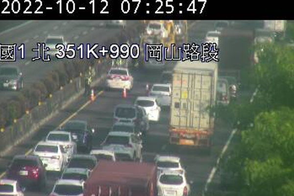 高公局表示,今天(12日)6時55分,國道1號北向351.6k、岡山路段,3輛小客車追撞交通事故,占用內側車道,後方車流回堵約9公里。