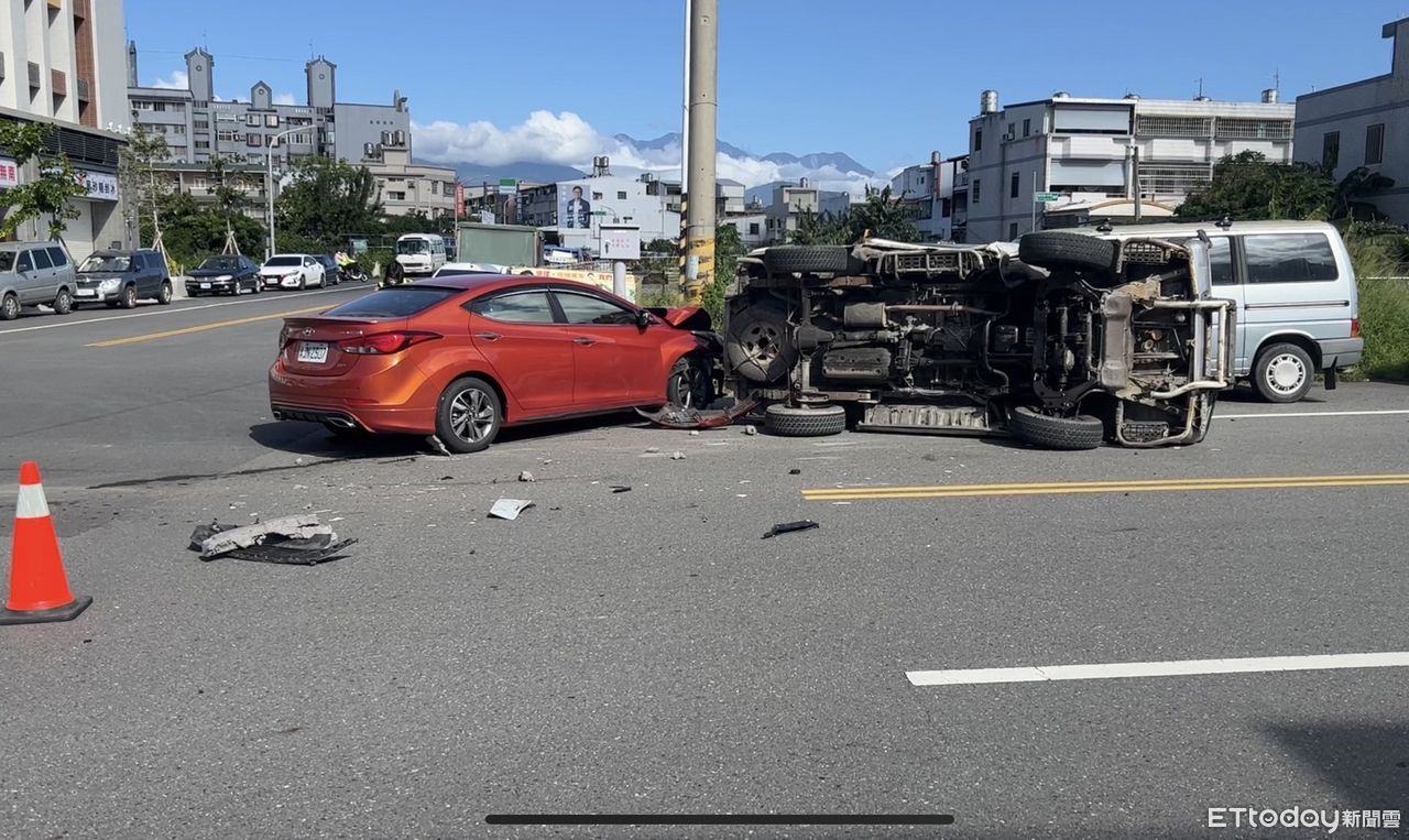 ▲車禍事故,造成1台車翻車。(圖/記者楊漢聲翻攝)