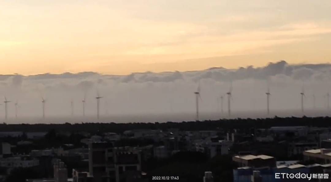 苗栗縣民賴文鑫說,他12日傍晚在竹南鎮朋友家,因朋友居住在大樓高樓層,往西可眺望到龍鳳漁港海景,發現漁港外海上出現有如高牆一般的「雲牆」綿亙,看起來像沙塵暴來襲,又像海嘯席捲而來,讓他驚奇不已,趕緊用手機拍錄下來。