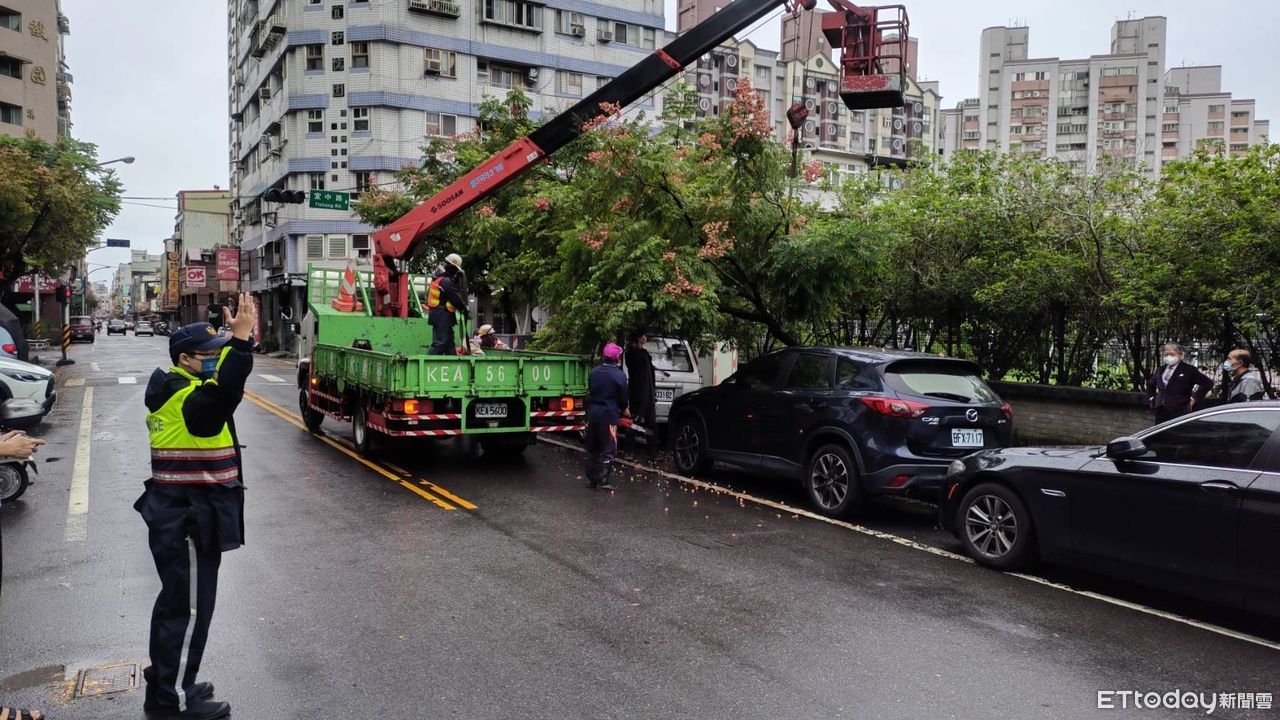 宜蘭分局上午8時30分許獲報,民權新路288號有路樹因強勁雨勢傾倒在車道上,民族派出所立即派遣警力趕赴現場處理,因路樹倒塌已影響人車通行,員警為避免路樹妨礙交通而發生交通事故,先行擺放交通錐並於現場實施交通疏導管制,並通知宜蘭市公所派遣相關單位處理。