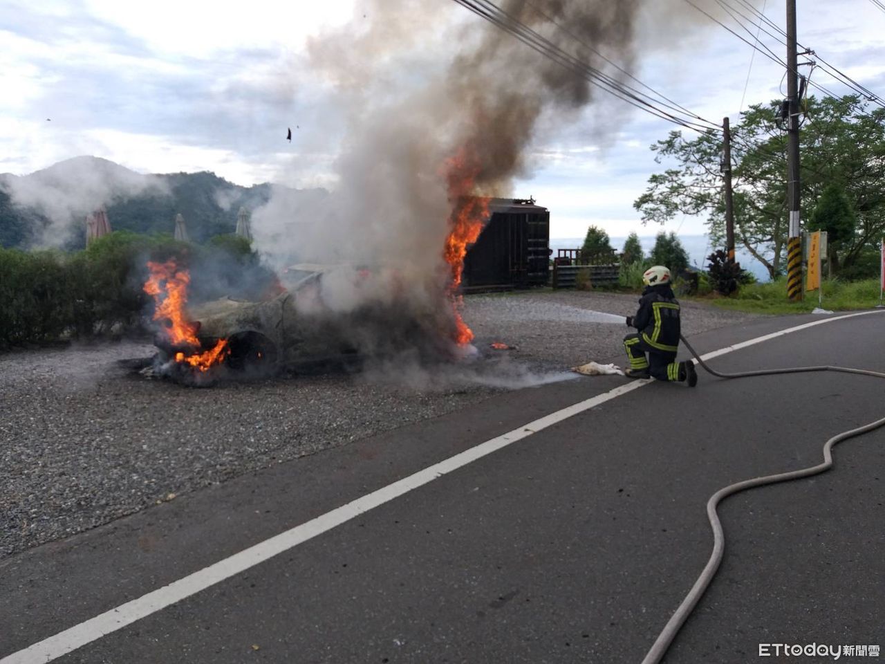 ▲嘉義縣番路鄉阿里山公路48.2公里處今日中午發生汽車火警。(圖/記者翁伊森攝)