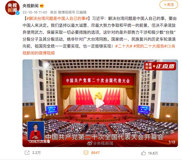 今(16)早的中共二十大大會結束後,中共中央總書記習近平提到的「解決台灣問題是中國人自己的事」登上微博熱搜,瀏覽數達到2.6億。官媒評論區刷滿「祖國必須統一」、「台灣是中國的!一直都是!」。