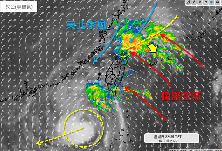 吳聖宇指出,今晚之後,共伴鋒面的位置應該就會向台灣東方到琉球一帶移動,陸地上的雨勢將趨緩;不過,迎風面的北海岸、東北角、宜蘭一帶仍可能持續會有下雨的情況出現,因此最需要注意的區域還是在北部、東北部到花蓮一帶區域。