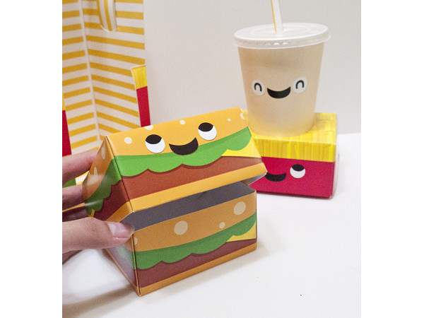 擬人化的設計,讓漢堡和薯條都有自己專屬外觀的包裝盒,搭配上可愛的快樂表情,讓人看到的瞬間,嘴角也不自覺得跟著上揚:)