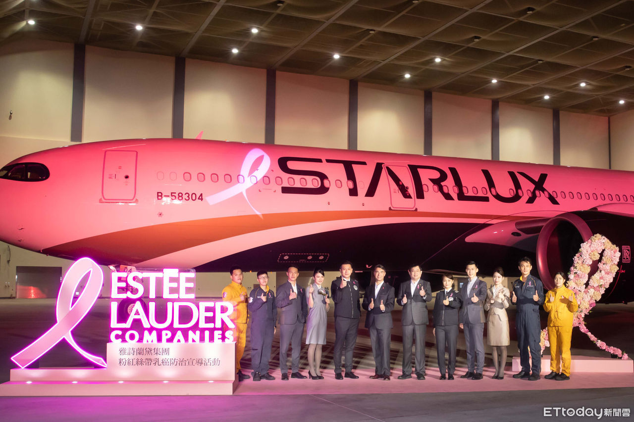 雅詩蘭黛集團今(17)晚舉辦粉紅絲帶慈善晚宴,星宇航空正式公開點燈畫面,透過燈光投影的沈浸式展演,將粉紅燈光渲染整架星宇航空A330neo機身,並投影粉紅絲帶,讓航機彷彿翱翔在奇幻的粉色天空中。