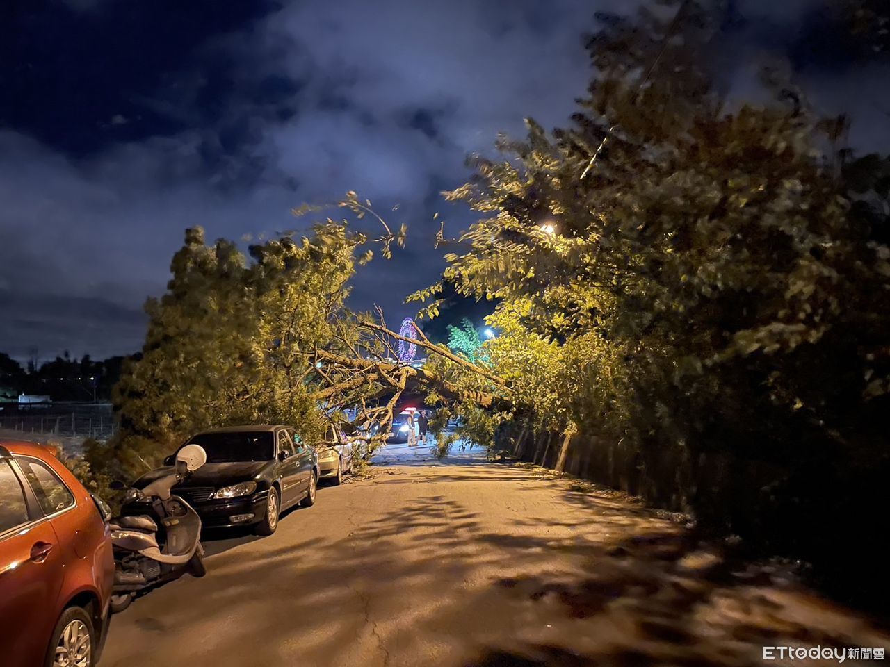 ▲台中后里月湖東路一顆大樹被風吹倒,該路段封路一整晚。(圖/民眾提供)