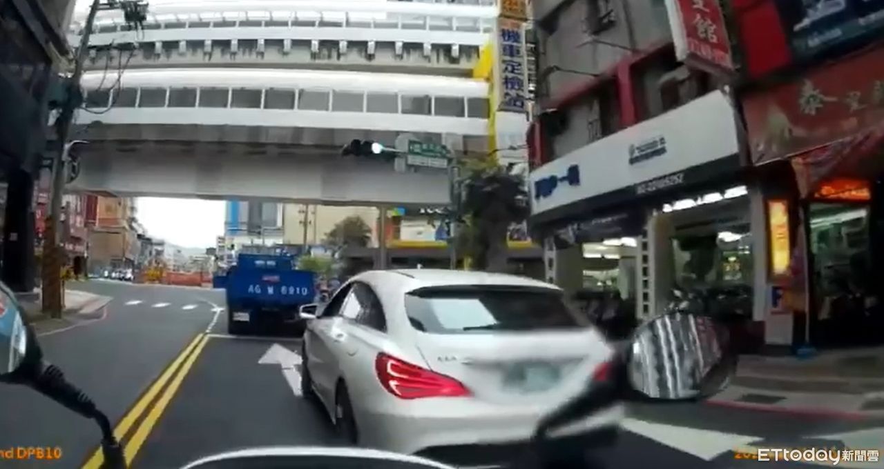 ▼賓士車危險駕駛還輾壓到騎士的左腳。(圖/記者陳雕文翻攝)