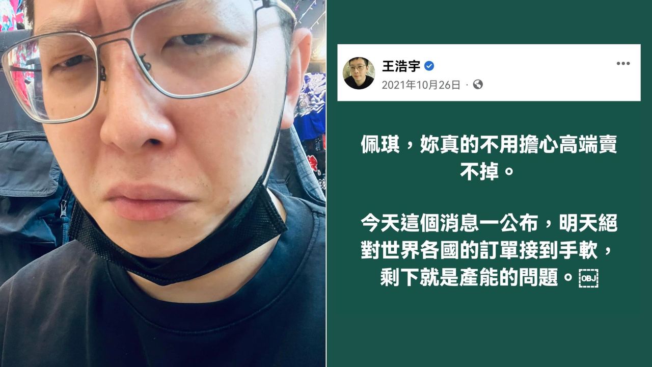 不少網友挖出王浩宇過去曾重砲回擊,台北市長柯文哲的夫人、醫師陳佩琪認為高端疫苗浪費錢的看法。他表示,「佩琪,妳真的不用擔心高端賣不掉」,更透露某一項消息公布後,隔天絕對世界各國的訂單接到手軟。依照發文時間點判斷,王浩宇指的應為世界衛生組織(WHO)當時公告的團結試驗疫苗聲明。