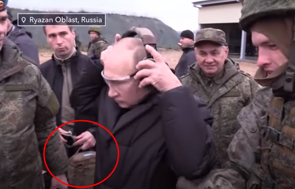 俄羅斯總統普丁20日一身黑衣視察梁贊地區軍事基地,並在現場試射SVD狙擊步槍,開了數槍。不過令人關注的是,在普丁身旁的人員手中,拿著的似乎是「核足球」(nuclear football)公事包。