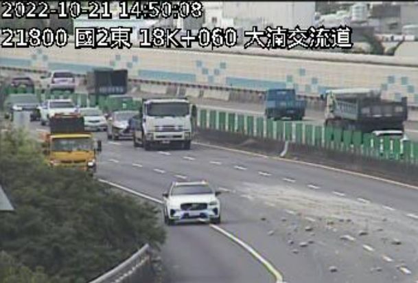 國道二號東向八德出口21日下午出現大片砂石散落,嚴重影響車輛通行,造成車流紫爆回堵約7公里,整個高速公路宛如大型停車場,工務單位已獲報到場處理,目前仍在積極排除當中,呼籲用路人行經該路段時減速慢行,或及早改道。