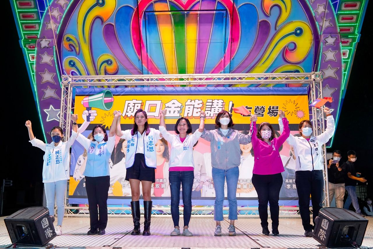 柯志恩廟口開講來到左營微笑公園,除了有選區議員陳麗珍、陳玫娟、李眉蓁、李雅芬以及白喬茵議員候選人之外,台北市議員鍾沛君更遠道從台北現身相挺,七位女將一字排開,成為左楠新靚點。