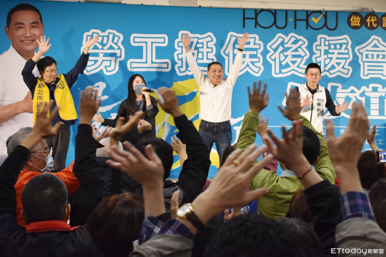 市總工會、產業總工會、職業總工會、產職總工會、各業總工會等五大工會理事長共同發起的「勞工後援會」,超過600名勞工代表把永安公園活動中心擠得水洩不通。侯友宜進場時一一和勞工朋友擊掌、擊肘,凍蒜聲浪接連不斷,展現力挺侯市長的熱情。