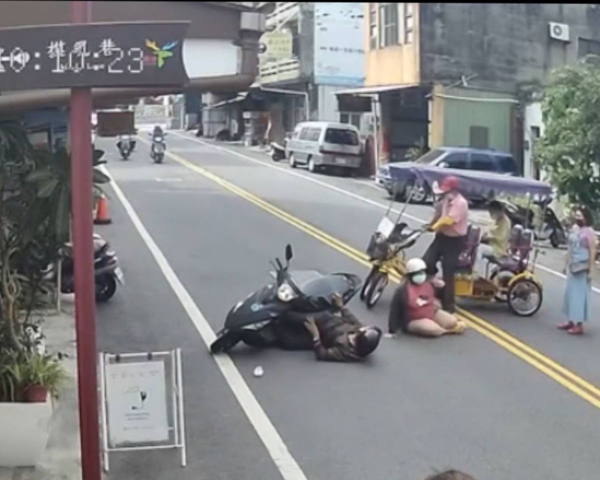 ▲鹿港三輪車跨雙黃線迴轉與機車碰撞。(圖/摸乳巷旁店家提供)