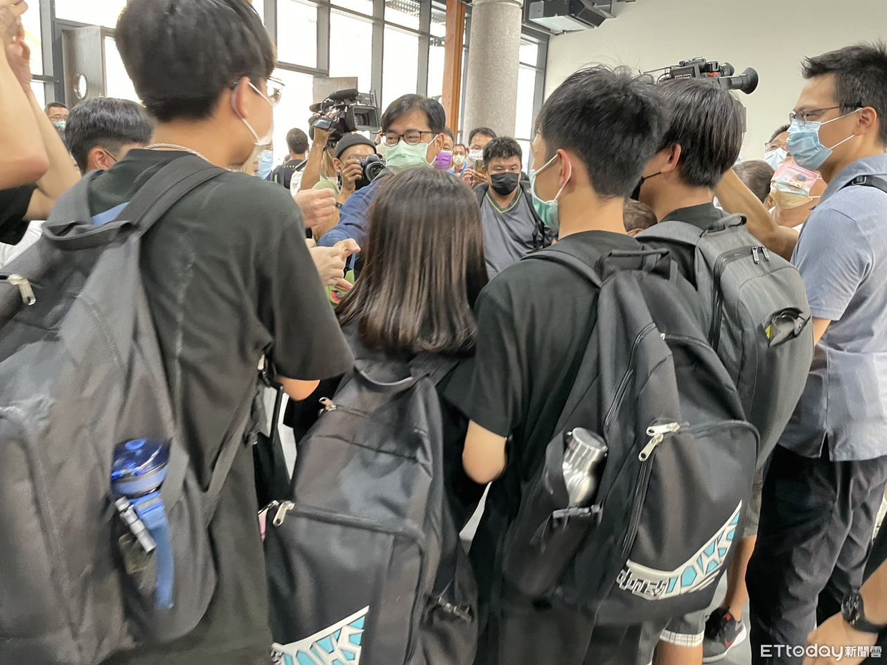 ▲一群黑衣學生突攔截陳其邁,拜託市長跟他們合照。(圖/記者許展溢攝)