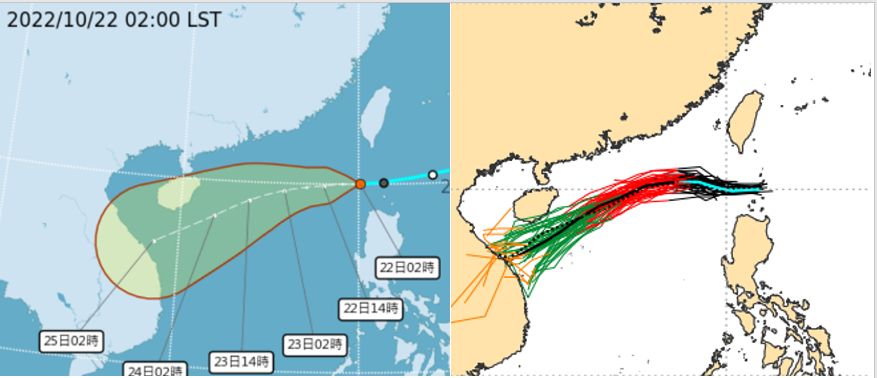 ▼左圖:中央氣象局22日2時「路徑潛勢預測圖」顯示,熱帶低壓在巴士海峽,向西轉西南西移動、往海南島南方海面前進;強度逐漸增強。右圖:最新(21日20時)歐洲模式(ECMWF)系集模擬顯示,路徑類似中央氣象局「潛勢預測圖」。(圖/三立準氣象· 老大洩天機)