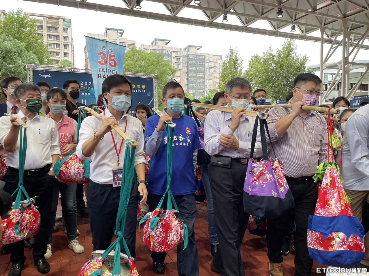 柯文哲今天上午出席台北客家義民嘉年華挑擔奉飯活動時,媒體頻頻追問有關城市博覽會預算、水門關不關等議題,但柯僅回應下午聯訪時間再回答,憂媒體搶拍擠成一團。黃珊珊、陳時中、蔣萬安也在接近8點鐘時陸續抵達會場,但3人同台沒有互動,陳時中及黃珊珊在等待柯文哲致詞前,先站在舞台左側等候,而蔣則「把握時間」,繞行會場一周向鄉親致意,還不忘比出號次「6號」。