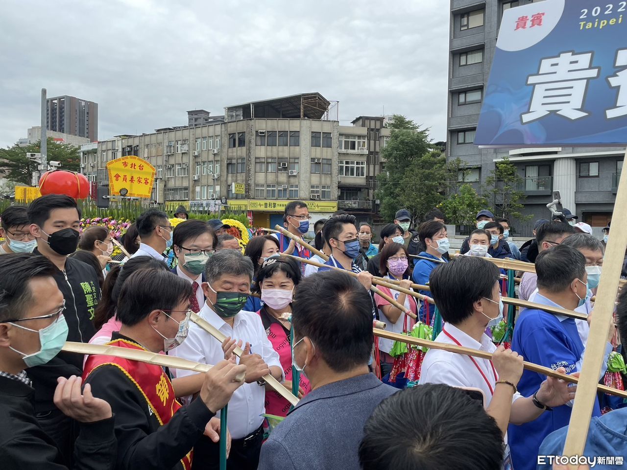 ▲柯文哲、蔣萬安、陳時中、黃珊珊出席2022台北客家義民嘉年華挑擔奉飯活動。(圖/記者黃國霖攝)