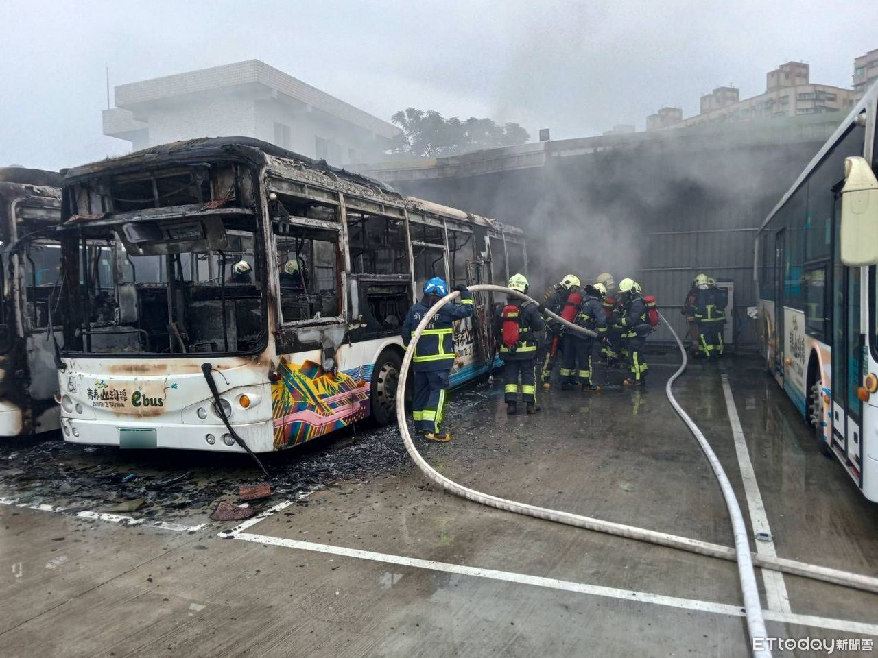 新北公車總站驚傳火警!新北市三芝區淡金路二段公車總站,今天下午1時37分發生火燒車事故,一輛青春山海線ebus電動公車在充電中,突然不明原因起火燃燒,燒到只剩下車架,大火波及隔壁停放的公車,消防隊獲報趕抵搶救,2時29分撲滅火勢,沒有造成人員傷亡,起火原因尚待鑑識調查釐清。
