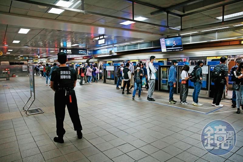 ▲北捷每日有高達160萬人次進出,除一般保全外,也聘請特勤保全(左)在月台巡邏駐守。