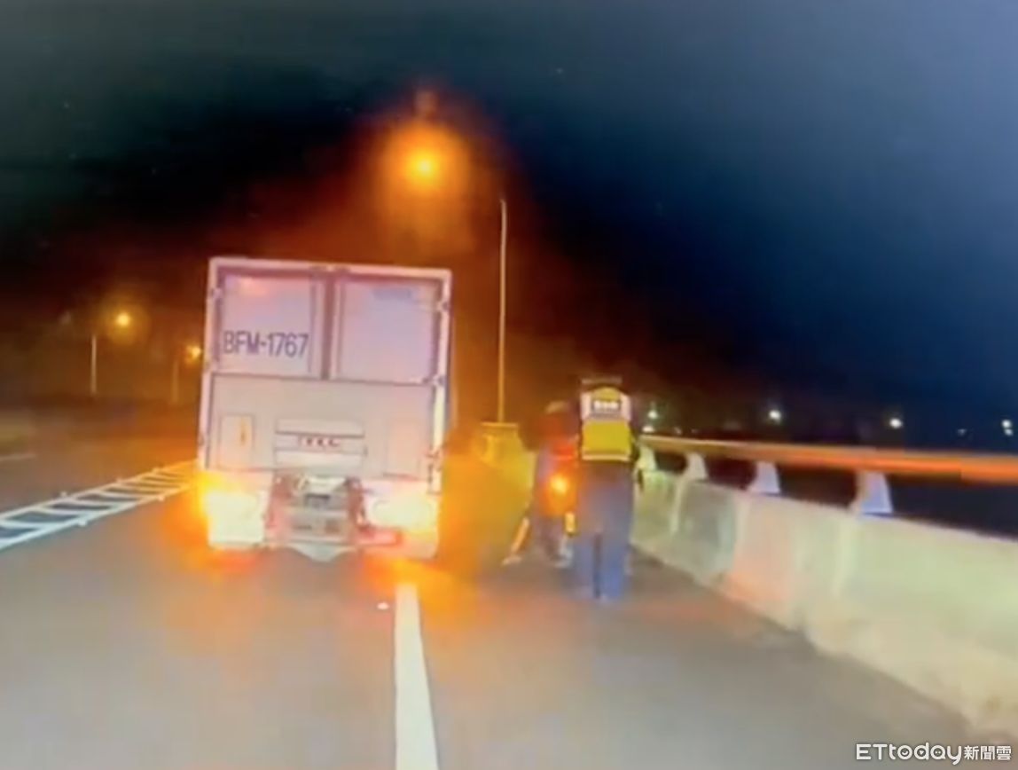 ▲重機騎士於台61線臺西路段遇強風受困,在警方與貨車司機協助擋風、護送平安下匝道,向警方道謝。(圖/記者蔡佩旻翻攝)