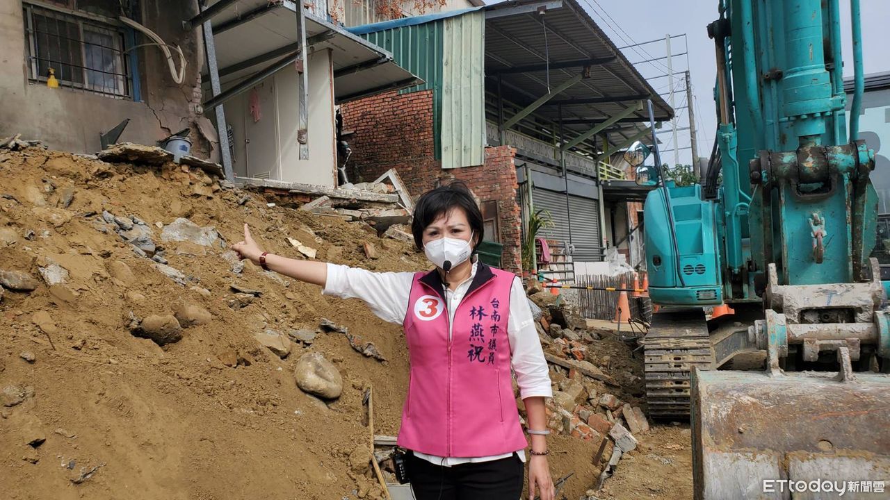 台南市議員林燕祝24日上午至永康區高速二街旁,因工務局施工造成嚴重崩塌、地基掏空的民宅會勘,林燕祝要求市府盡快解決問題與後續的相關賠償。