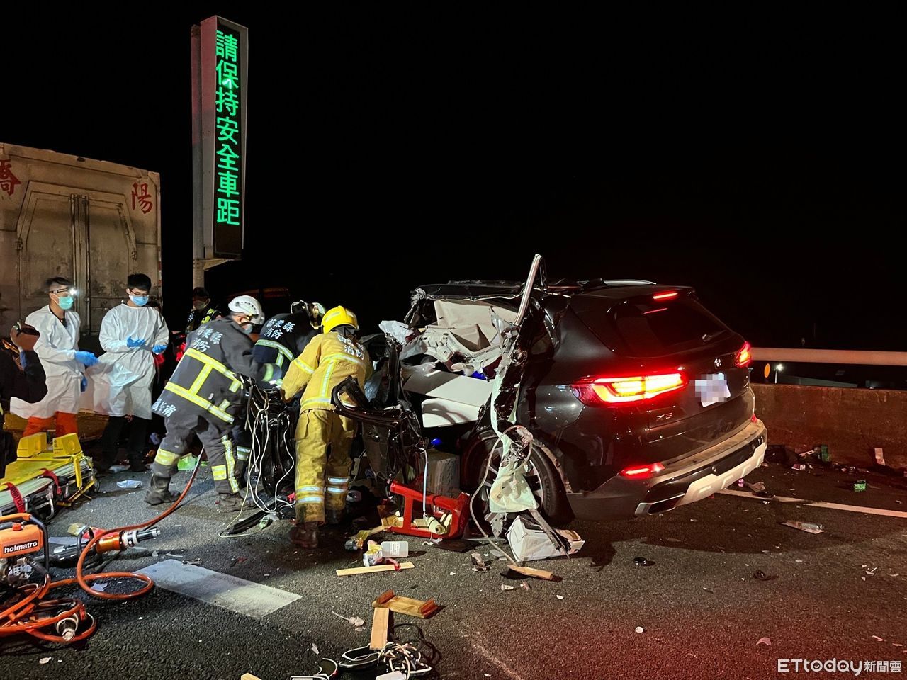 消防人員表示,事發於深夜10時24分,現場為一輛休旅車擦撞貨櫃車,導致休旅車男性駕駛受困,由消防人員用破壞器材救出脫困。