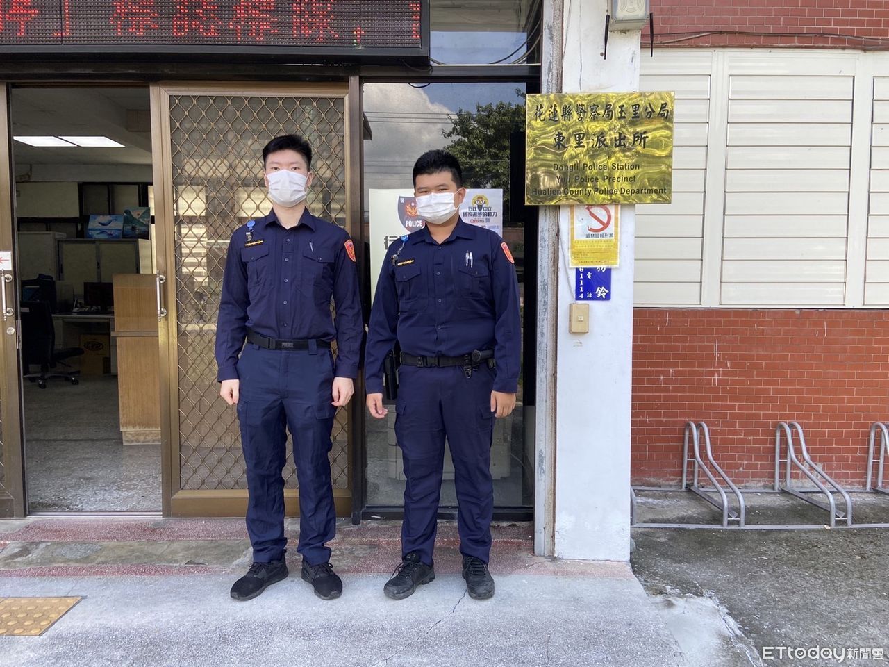 花蓮東里派出所警員郭駿育、實務訓練生鄭鋆翔於23日中午執行巡邏勤務時接獲報案,指曾姓男子騎著重機受困於六十石山下山產業道路且深陷泥濘,前方道路坍方已有落石,一旁就是陡峭懸崖,情況危急請求協助。