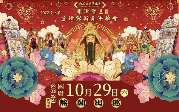 桃園區大廟景福宮2022文化季-開漳聖王遶境踩街嘉年華活動,本週六(29日)農曆10月5日隆重登場。景福宮主委簡征潭表示,活動當天主神開漳聖王及神將陣頭在桃園區市中心出巡祈福,期藉由巡守遶境祈求轄區平安、疫情退散,遶境隊伍沿路贈送繽紛氣球和鹹光餅,歡迎大小朋友加入遊行。