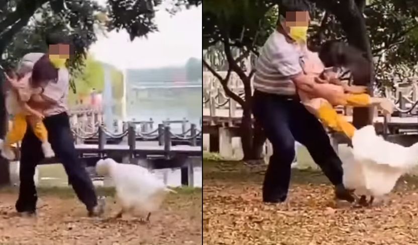 爺爺原先抱著孫女倒退向後跑,但看到白鵝已經相當靠近並且要攻擊,他則用力將孫女迴旋甩出,白鵝被孫女的腳擊中後才嚇得離開。