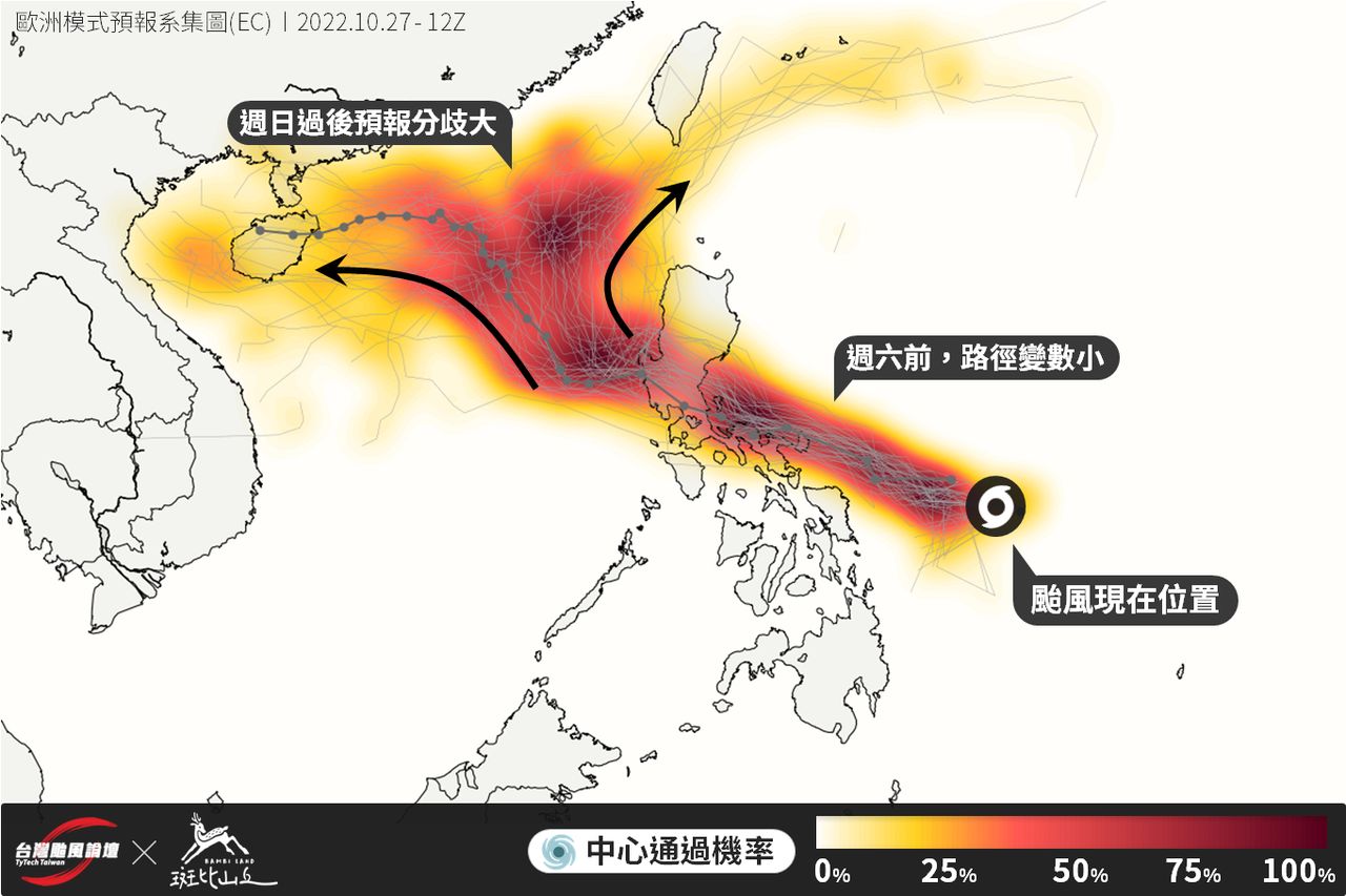 「台灣颱風論壇|天氣特急」表示,其實從圖上可以明顯看出,系集成員對周日後的路徑看法,幾乎是對半拆,這樣的情況大概已經持續一天半,決定性預報的那一條,偏在系集西側,而中心通過機率較高的區域,落在東沙島附近。