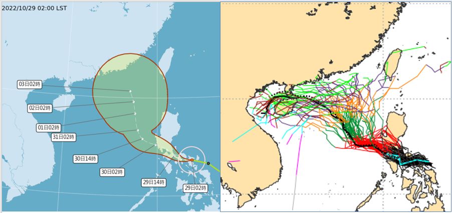 ▲29日2時中央氣象局「路徑潛勢預測圖」(左圖)與28日20時歐洲(ECMWF右圖)系集模式顯示,「輕颱奈格」通過呂宋島後再逐漸轉北,轉向位置及之後的行徑有很大的「不確定性」(左圖紅框範圍及右圖系集路徑分散)。(圖/三立準氣象· 老大洩天機)