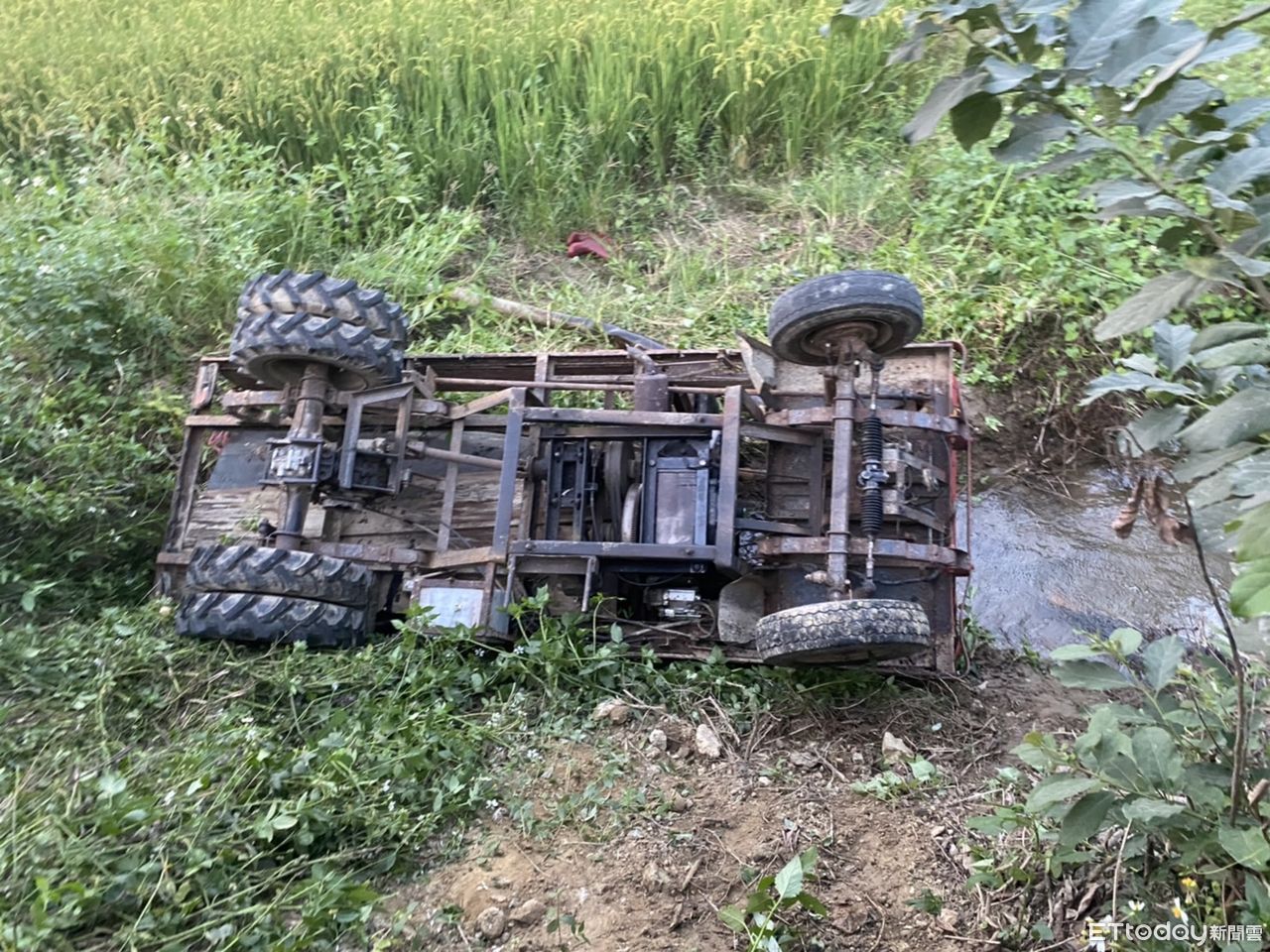 ▲白河區汴頭里1處產業道路,80歲老婦疑駕農用搬運車不慎翻覆,摔落深田野無生命跡象,經救護人員CPR及AED搶救緊急送醫仍不治。(圖/民眾提供,下同)