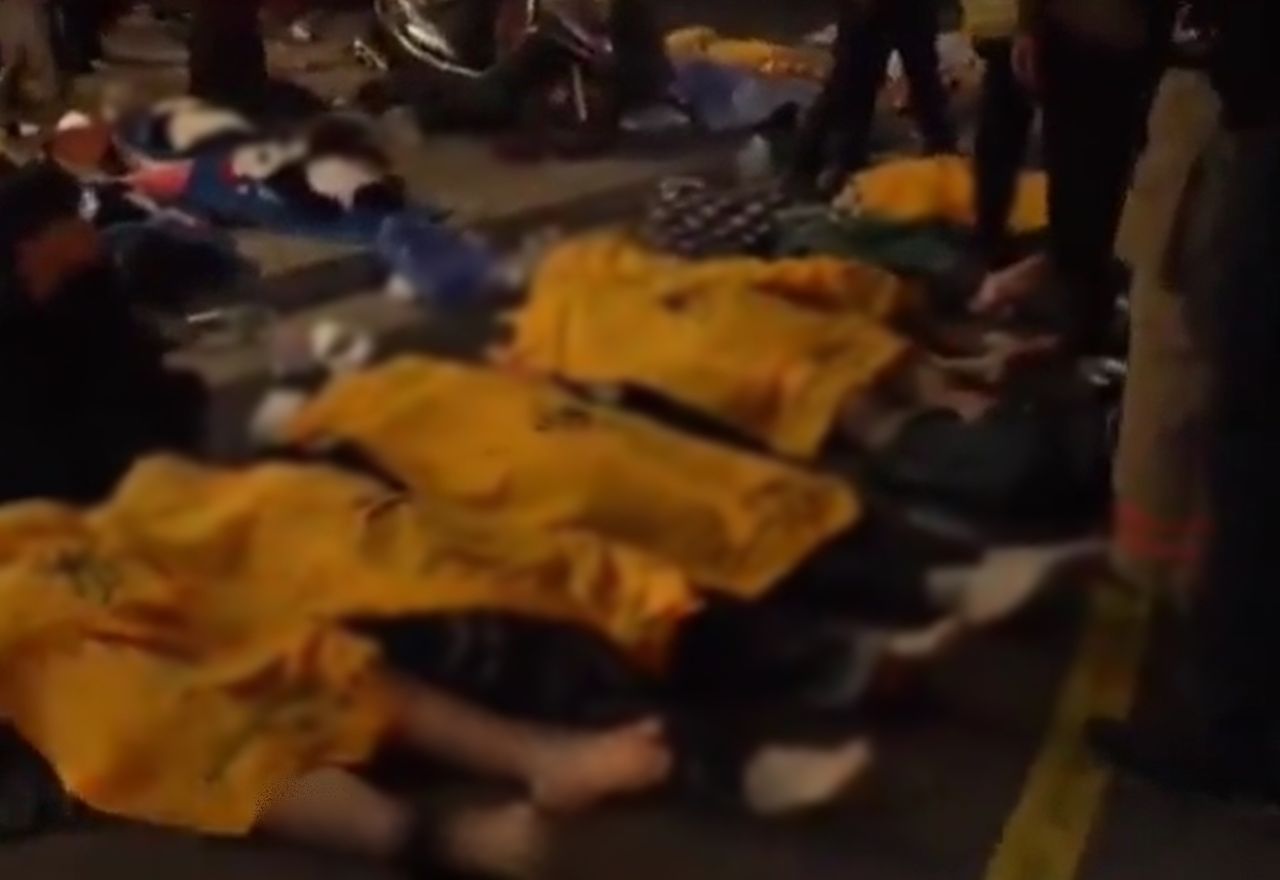 現場畫面顯示,倒地的除了失去呼吸心跳仍在被CPR急救的民眾外,一旁還有蓋上各種布條、毛毯的遺體,男男女女幾乎全數赤腳,部分褲子脫落到腳踝處,還有人手部因為擠壓過猛,早已失去血色變得相當蒼白。