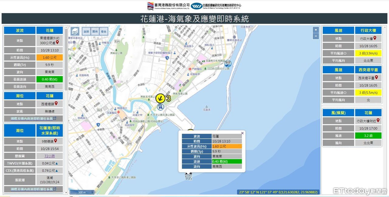 ▲圖為海氣象及即時應變系統花蓮港頁面,目前資訊已公開顯示於花蓮港務分公司網頁。(圖/花蓮港務分公司提供)
