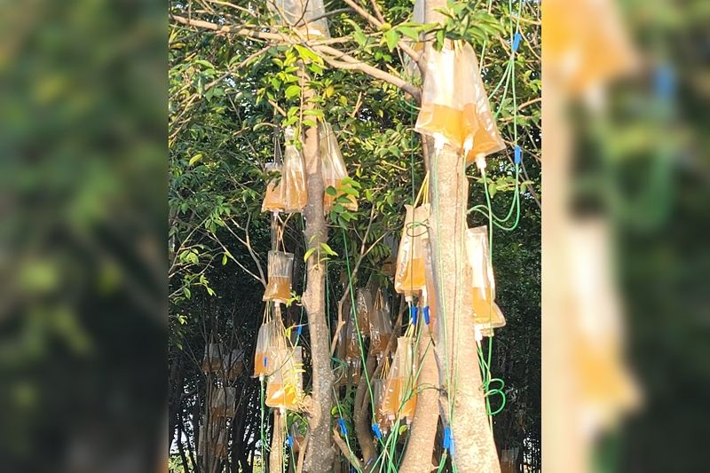 這名男子在「路上觀察學院」分享2張照片,同時附上「樹阿公們帶著尿袋群聚曬太陽」的文字。而依據照片內容,這些樹上掛滿了許多黃色的不明液體,且液體下方還有一根長長的綠色管子,這些管子直接插入樹幹裡,看起來是在往樹木灌輸某種藥品,這也讓男子感到困惑,「其實我不知道掛這個用意。」
