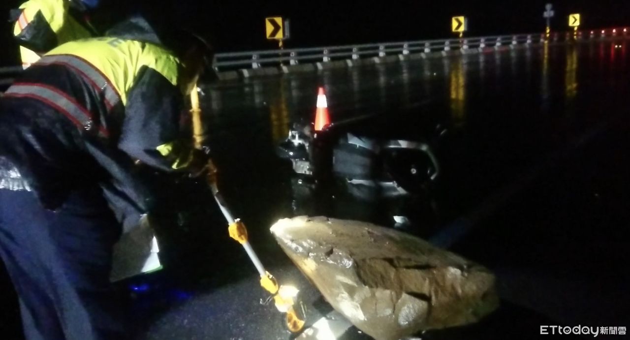 ▲台九線346K落石坍方,騎士閃避不及撞上。(圖/記者楊漢聲翻攝,下同)