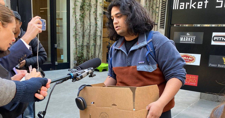 ▲2名男子跑到推特門口假裝被解雇的員工,結果把一種媒體都騙過去了。(圖/翻攝自推特)