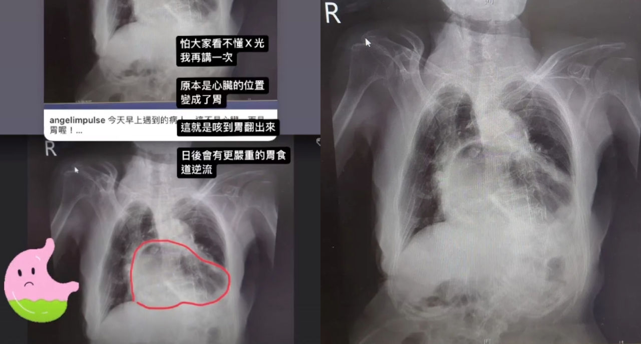 北市聯醫中興院區醫生姜冠宇今(2日)發文表示,今天碰到一名阿姨來看診,一照X光片發現,原本是心臟的位置,變成了胃。姜冠宇提醒,這不是1、2次嗆到就咳成這樣,若有長期咳嗽問題要特別注意。
