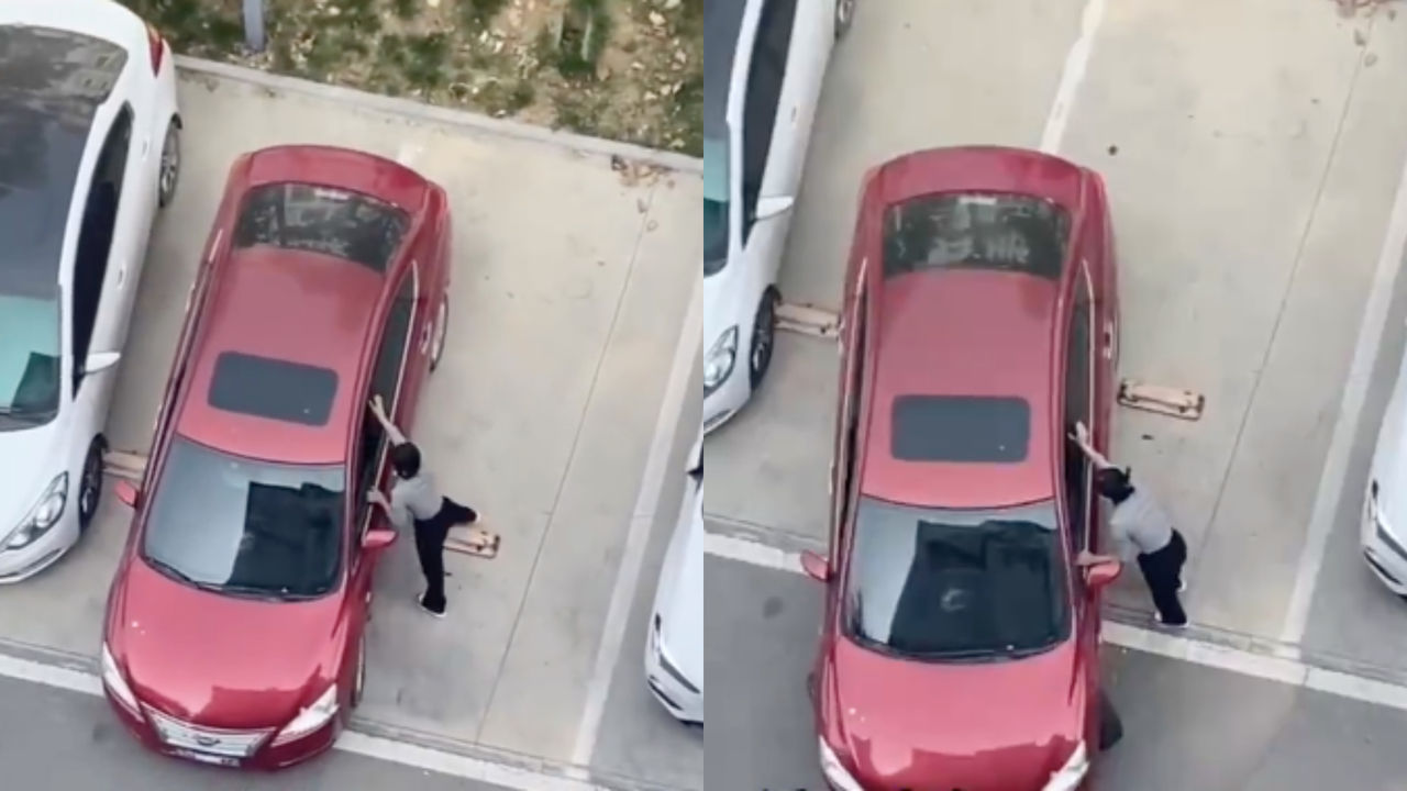 綜合陸媒報導,穿著灰衣的女子開著紅色轎車,來來回回就是停不好車,她索性「不幹了!」,下車捲起袖子,上演人力停車法。