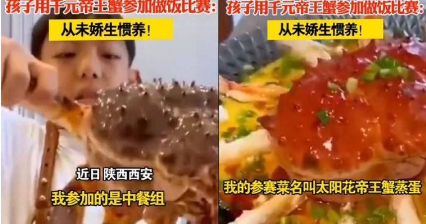▲近日陝西一名小學生要參加學校的廚藝大賽,孩子父親特地幫他準備了帝王蟹供孩子參賽做飯,沒想到影片曝光後,卻遭不少網友質疑家長在炫富。(圖/翻攝海報新聞)