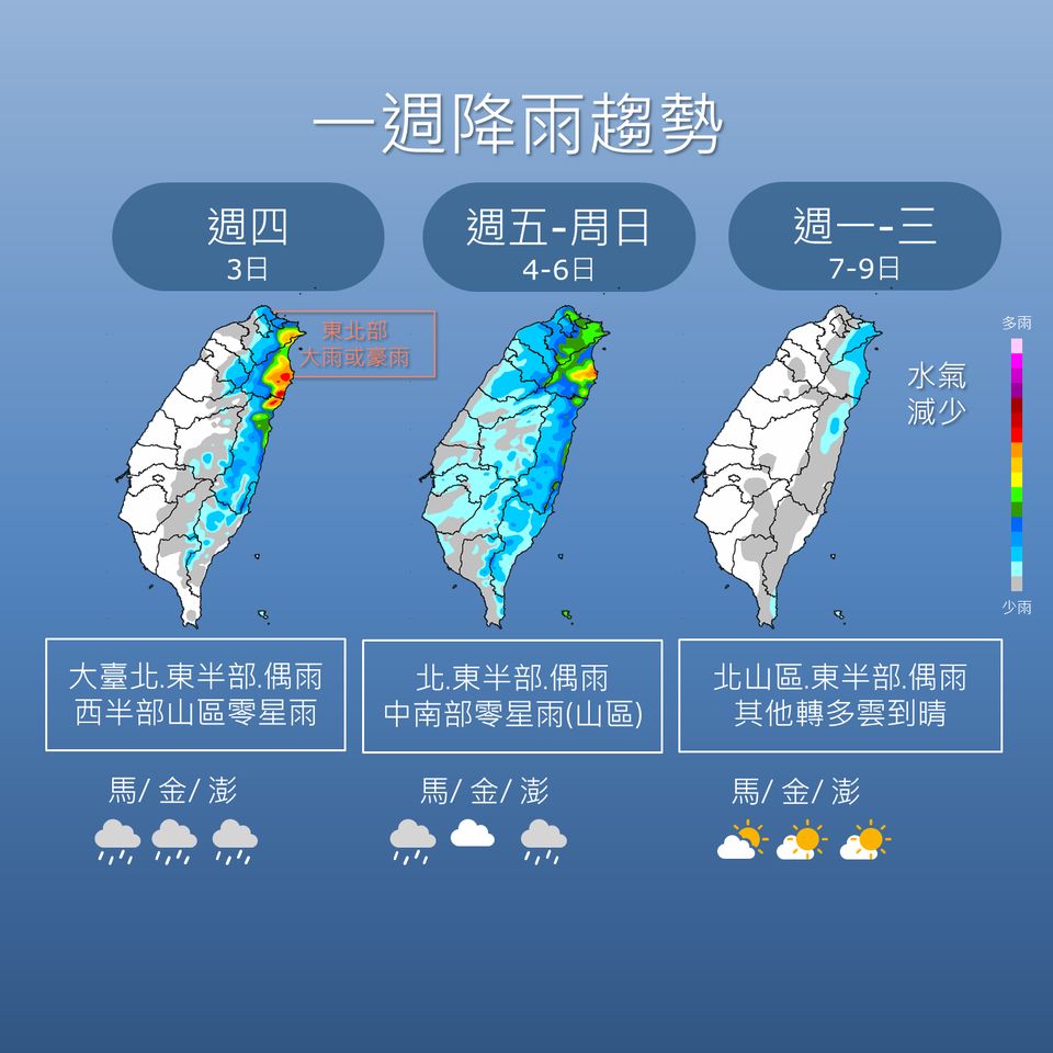 奈格颱風減弱為熱帶性低氣壓,不過颱風外圍仍有水氣,迎風面東北部、東半部有零星降雨,未來一周降雨出現3階段變化,其中今晚(11/3)東北季風增強,東北部有大雨或豪雨,雨勢較大持續到明天;周五到周日(11/4~11/6)北部、東北部及中南部山區有雨;下周一到三(11/7~11/9)水氣減,北部山區和東半部有雨。