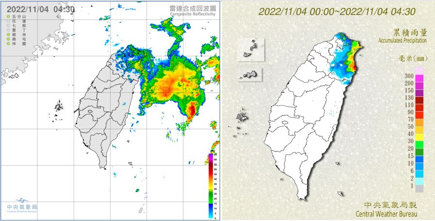 ▲今晨4:30雷達回波合成圖顯示,迎風面回波消長,東北部海面有較強回波(左圖)。4:30累積雨量圖顯示,東北部、大台北有雨,桃園及花蓮地區零星飄雨(右圖) 。(圖/三立準氣象· 老大洩天機)