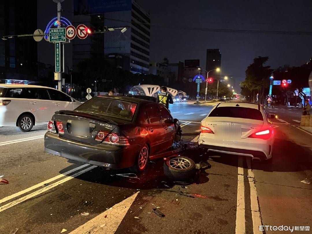 ▲▼台中張姓男子酒駕追撞4輛停等紅燈的自小客車,連輪胎都掉落,2車道因此堵塞1小時。(圖/民眾提供,下同)