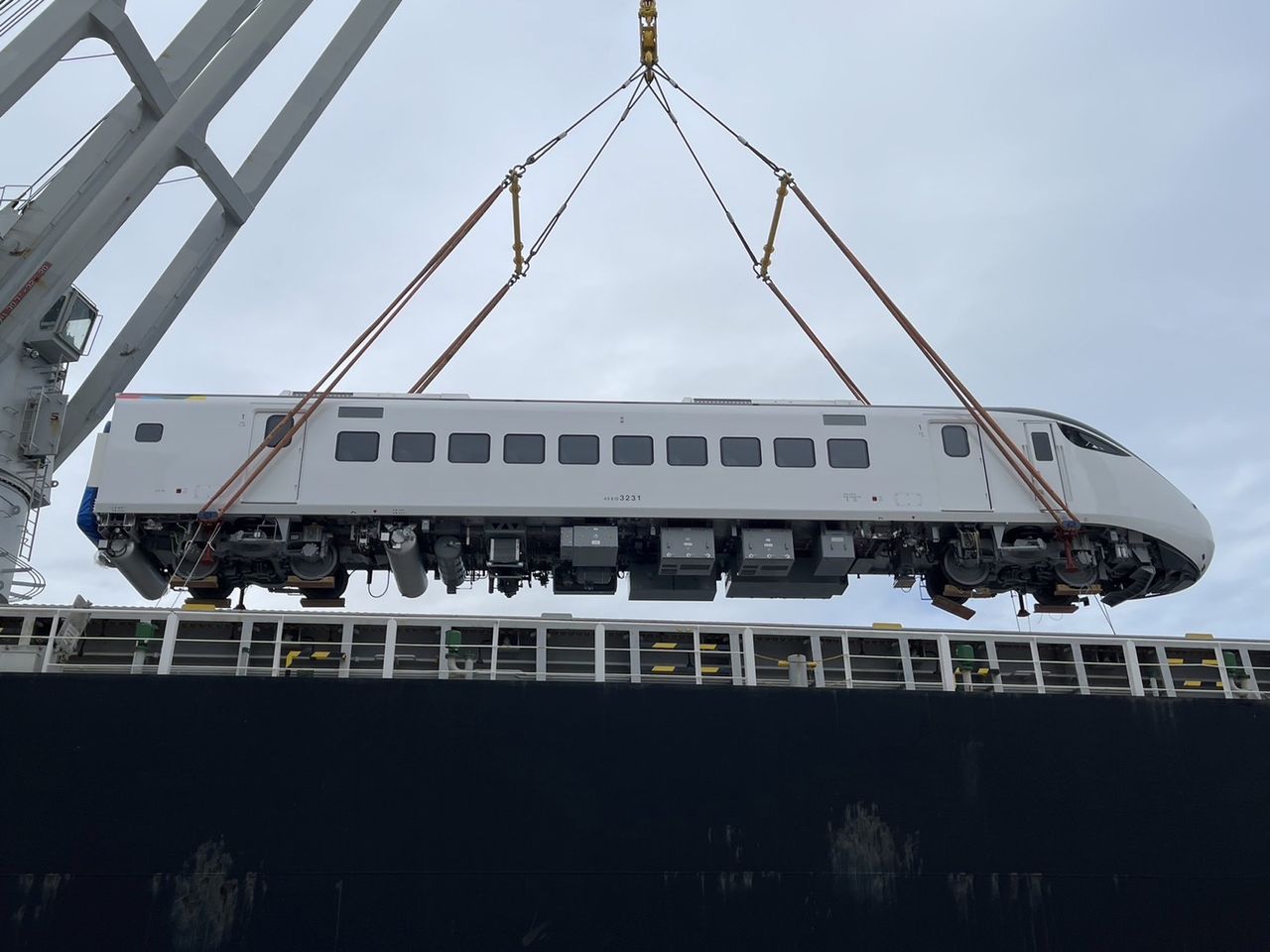 台鐵局EMU3000新城際列車首編特仕車於今(6)日抵達花蓮港,預計明天卸船完畢,若相關測試順利,可望於明(2023)年春節疏運投入營運,開行花東線及本線團體旅遊列車,並提供申請包租專車。