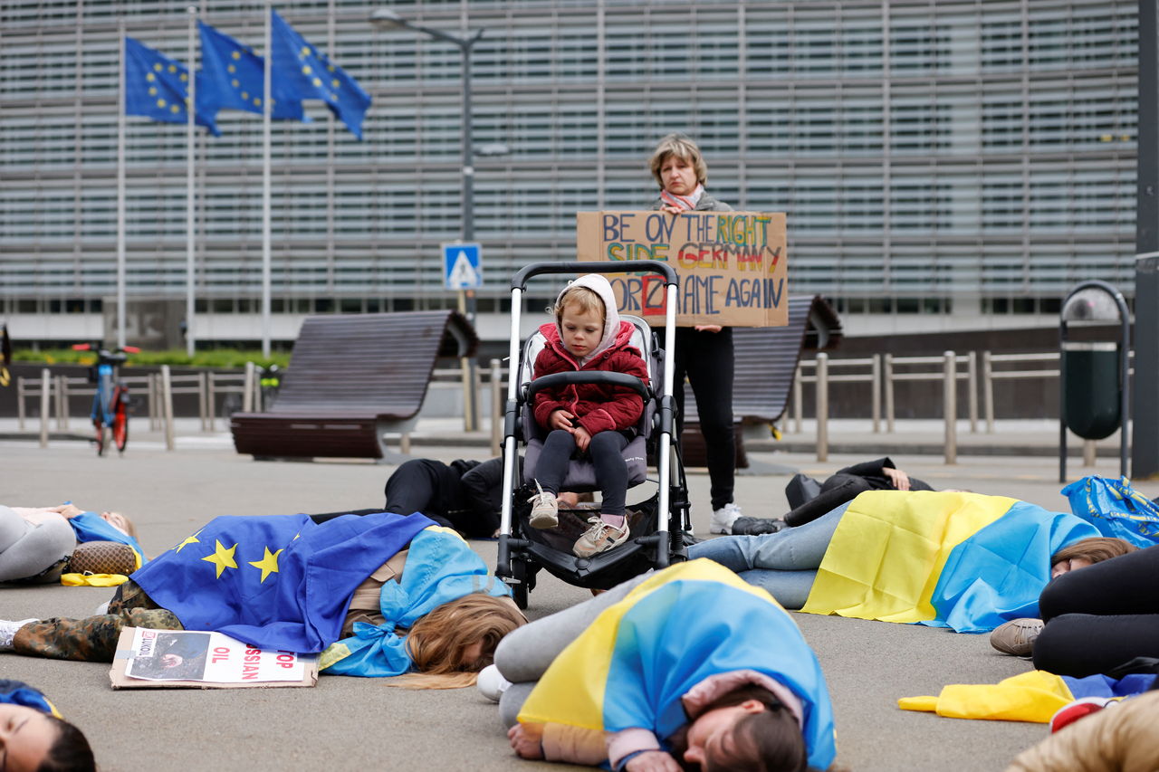 ▲ 氣候變遷社運人士4月間在布魯塞爾進行抗議活動,呼籲歐盟立即對俄羅斯的油氣實施禁運制裁。(圖/路透)