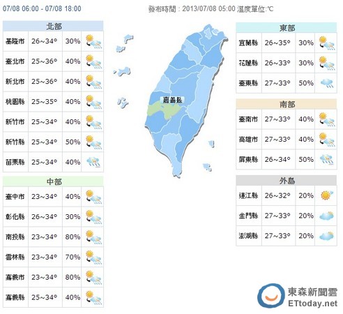 另外,中央氣象局表示,8、9日台灣各地及澎湖、金門、馬祖大多為高溫炎熱的天氣,8日西半部、東北部及東部地區午後有局部短暫雷陣雨,東南部地區有局部短暫陣雨;9日西半部地區午後仍有局部短暫雷陣雨,東南部地區有局部短暫陣雨。8、9日兩天午後有局部性大雨發生的機率。