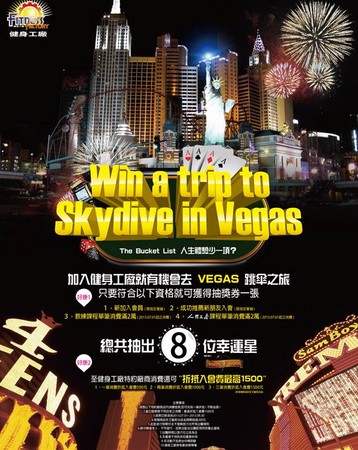 不可或缺的人生體驗是環遊世界?還是挑戰體能極限?即日起加入健身工廠,就有機會成為「Vegas跳傘之旅」幸運星,體驗驚險刺激的飛機跳傘 (skydive)、大峽谷天空步道 (skywalk),一睹好萊塢環球影城迷人風采,滿足童心一遊迪士尼樂園以及小試身手體驗賭城博奕樂趣,健身工廠將要實現最驚奇、最不可思議的人生體驗!