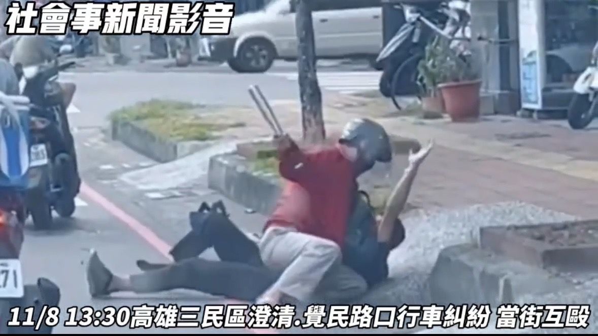 高雄市三民區覺民路、澄清路口,今(8)日下午發生一起街頭互毆糾紛,根據曝光的現場影像,一開始一名身穿黑衣的男子遭到另一名身穿紅色外套、頭戴安全帽的男子持球棒壓在地上打,接著黑衣男起身之後反推壓制紅外套男在地,導致2人雙雙送醫。